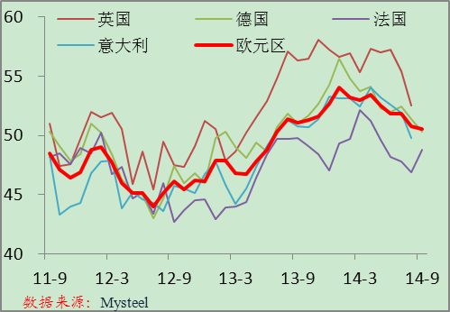 歐元區(qū)9月制造業(yè)PMI初值為50.5%,連續(xù)5個(gè)月環(huán)比下降,表明歐元區(qū)經(jīng)濟(jì)增長(zhǎng)依舊低迷,加之當(dāng)前歐元區(qū)低通脹未見(jiàn)起色,預(yù)計(jì)經(jīng)濟(jì)低增長(zhǎng)可能在一段時(shí)間內(nèi)為歐元區(qū)經(jīng)濟(jì)的常態(tài)。目前歐洲央行采取逐步放寬政策的措施來(lái)改善歐元區(qū)信貸,但從當(dāng)前來(lái)看,并沒(méi)有多大改善,預(yù)計(jì)歐洲央行將進(jìn)一步放寬政策以挽救歐元區(qū)經(jīng)濟(jì)。但即便如此,在財(cái)政改革遲緩的情況下,貨幣政策對(duì)于經(jīng)濟(jì)的刺激效果不大。從歐洲下游行業(yè)的表現(xiàn)看,增長(zhǎng)速度也是連續(xù)下滑。