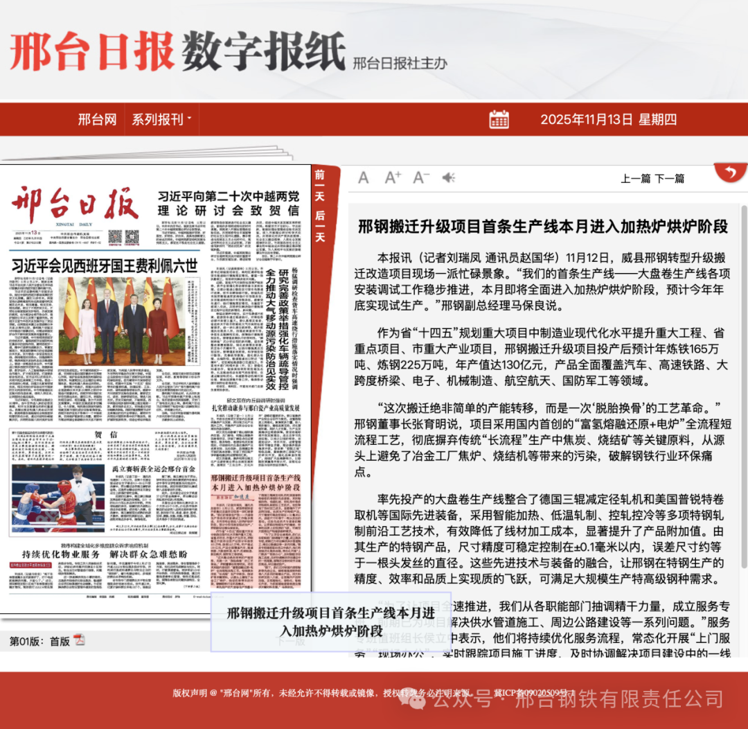 率先投產(chǎn)的大盤卷生產(chǎn)線整合了德國三輥減定徑軋機(jī)和美國普銳特卷取機(jī)等國際先進(jìn)裝備,采用智能加熱、低溫軋制、控軋控冷等多項特鋼軋制前沿工藝技術(shù),有效降低了線材加工成本,顯著提升了產(chǎn)品附加值。由其生產(chǎn)的特鋼產(chǎn)品,尺寸精度可穩(wěn)定控制在±0.1毫米以內(nèi),誤差尺寸約等于一根頭發(fā)絲的直徑。這些先進(jìn)技術(shù)與裝備的融合,讓邢鋼在特鋼生產(chǎn)的精度、效率和品質(zhì)上實現(xiàn)質(zhì)的飛躍,可滿足大規(guī)模生產(chǎn)特高級鋼種需求。“為了讓項目全速推進(jìn),我們從各職能部門抽調(diào)精干力量,成立服務(wù)專班,前期已為項目解決供水管道施工、周邊公路建設(shè)等一系列問題。”服務(wù)專班值班組長侯立中表示,他們將持續(xù)優(yōu)化服務(wù)流程,常態(tài)化開展“上門服務(wù)”“現(xiàn)場辦公”,實時跟蹤項目施工進(jìn)度,及時協(xié)調(diào)解決項目建設(shè)中的一線難題,保障項目按時間節(jié)點高效推進(jìn),早日建成投產(chǎn)。“眼下,我們正對標(biāo)國內(nèi)首鋼智新等先進(jìn)企業(yè),瞄準(zhǔn)高強(qiáng)度耐熱鋼等八大系列的高精尖產(chǎn)品,加大科技研發(fā)投入力度,全面提升產(chǎn)品附加值,實現(xiàn)高端化、綠色化、智能化升級,為我國高端裝備制造業(yè)提供關(guān)鍵材料支撐。”馬保良說。